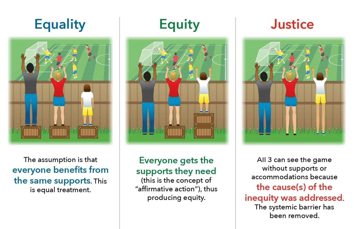 And there you have it. We can establish perfect equality without bothering with “support” or “accommodations” just by making everyone the same height. Problem solved! The beauty of the picture above is that it captures the same idea as the first picture, but it—more accurately—suggests that the causes of inequality are not quite so easily discernible or altered or—most importantly—unjust. If we’re talking about tearing down “the system”—represented by a fence—why, that’s at least theoretically possible. But if we come to recognize that “the system” is no more responsible for the height of these kids as it is for what produces a multitude of other varieties, the only way equality could truly be established would be to alter human nature itself. “There always must remain some individual deprivation or scarcity, which we are too prone to call ‘injustice,’” Defining JusticeBut is that what the Left means by justice? Certainly not. The language and imagery of justice is often couched in a moral, not merely a legal, framework. That is, justice is a virtue which should be pursued with passion. Any limitations on justice would be an injustice. The stuffy, legal definition just won’t do as it doesn’t compel us to go about proactively addressing injustices. It only tells us what is or is not just according to the law and restricts our actions to law enforcement and the judicial process. “If justice is a virtue, it’s a strange one,” Defining Social JusticeThe attempt to enforce some conception of justice as a virtue—not just as a legal matter—is what we might call social justice. But while justice in a legal sense is easily defined, social justice is not. “The idea of ‘Social Justice’…takes this concept out of its original legal context and attempts to apply it in an area for which it was not designed: society in general,” continues the This point bears repeating; social justice is meaningless for the sufficient reason we can’t settle on a definition. As “…has probably become the most confusing expression in our entire moral and political vocabulary…The confusion that it spreads, within the very area wherein it is most used, is partly due to its describing not only phenomena produced by various modes of cooperation among men, such as in a ‘society’, but also the kinds of actions that promote and serve such orders. From this latter usage it has increasingly been turned into an exhortation, a sort of guide-word for rationalist morals intended to displace traditional morals, and now increasingly supplants the word ‘good’ as a designation of what is morally right…factual and normative meanings of the word ‘social’ constantly alternate, and what at first seems a description imperceptibly turns into a prescription.” Notice here again is the implicit idea that there’s something wrong with “the system” but no clear directive what we are to do about the matter or who, specifically, is to blame. If a legal injustice is committed—say, if Tom robs Jack at gunpoint—we can follow the legal framework to render justice on Tom and for Jack. But if Tom belongs to a class that earns more than Jack’s class, what do we do to change “the system” that imposed this “injustice”? Is everyone in Tom’s class equally guilty and everyone in Jack’s class equally victimized? It is true there is more to justice than merely identifying what is legal and what isn’t. There was an era in which slavery was perfectly legal in parts of the United States, but that hardly made slavery “just”. Yet a distinction can be made between questions of justice that touch on fundamental ideas of what it means to be human, the limitations of State power, and our duties and obligations towards one another as fellow human beings and questions of justice that speak to an ideologically driven preconceived (and unproven) notion of what an ideal society should look like. “Most policy questions do not rise to the level of fundamental matters of justice,” But what of the question of societal equality? Does justice mean taking from those who belong to Tom’s class and giving it away to Jack’s class? Can white America achieve “justice” by apologizing for their whiteness and offering reparations to black America? Not so, argues Roger Scruton, for “duties of charity are not duties of justice.” Justice requires duty, not civility or generosity. “If we fail to perform a duty of justice we commit an injustice—in other words, we wrong someone.” Slavery is an injustice because it wrongs those who are enslaved and degrades those who own slaves. But the accident of our birth into a class or race does not create an injustice. It was that line of thinking that justified slavery in the first place. The State plays a role in administering justice, but it’s a necessarily limited role. As Justice as SuchThere is a distinction to be made between justice as a moral concept—what historian Garry Wills calls “justice as such”—and the limited justice pursued within institutions. “The particular aim of the state is not to achieve justice, and certainly not to dispense it…This, of course, does not mean that the state is to be unjust, or free of the imperatives of the moral law. The state, like the family, like the corporation, like the labor union, is bound by the laws of morality that are incumbent on all human endeavor, corporate as well as individual. In carrying out its function, the state must act with justice. But its specific aim is not to enforce justice as such. The family, too, must observe right order—the child obeying, the parent avoiding undue laxity or severity; husband and wife helping each other, yet observing measure in their demands upon each other. This due measure, this order of right, is achieved by the observance of justice; yet the formal aim of the family is not sheer justice as such. Its aim is to give birt